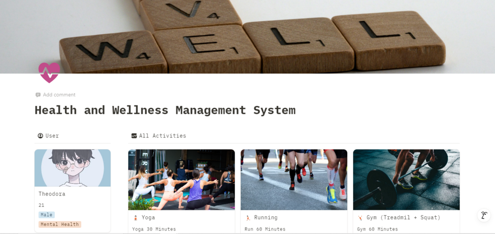 This "Health & Wellness Management" template is designed to help users manage and monitor their health and fitness systematically. With five main interconnected databases, this template provides a comprehensive tracking experience for physical activity, sleep patterns, and nutritional intake. User is a database that stores users' personal information, such as name, age, weight and health goals, which is the basis for more personalized analysis and recommendations. The Activity Database contains a list of physical activities, such as running, yoga, gym, complete with detailed duration.